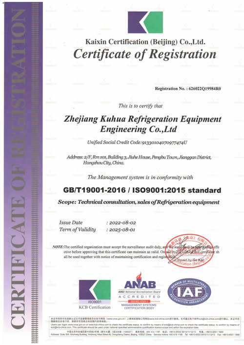 質量管理體系認證證書  ; 庫華制冷質量管理體系認證 ISO9001:2015標準 制冷設備的技術咨詢、銷售及售后維修服務 庫華制冷成立于2013年,完工冷庫項目約3600個,冷庫建造全國可做,歡迎聯系我們,任何類型冷庫均可免費提供全套建造方案、設計方案和報價清單,電話:15355424256(微信同號)
